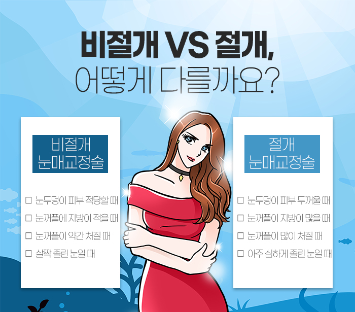 그리고 절개법의 경우에는 앞서 계속 말씀드린 것처럼 눈두덩이의 피부가 두꺼운 경우나 눈꺼풀에 지방이 많은 경우에 적합합니다. 또 눈꺼풀이 많이 처졌거나 아주 심하게 졸린 눈인 경우에 적합한데요.